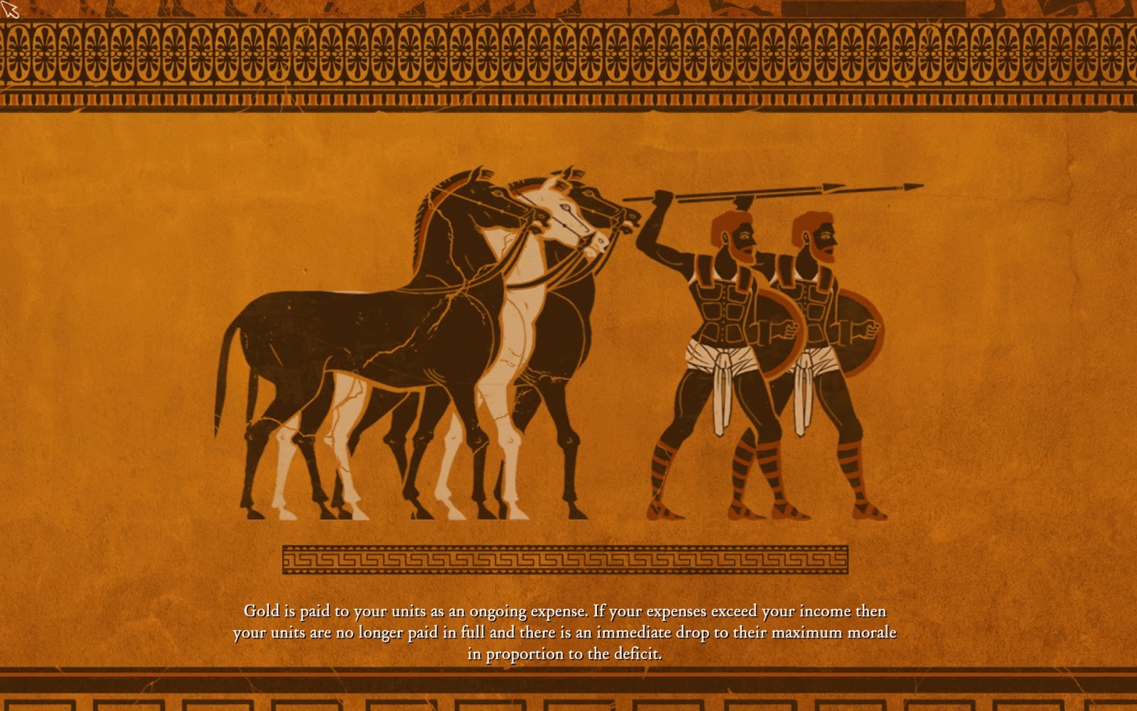 Hra umí spoustu věcí, které jsem si zatím nevyzkoušel. Překvapuje komplexností a hardcore hratelností. Bez zbytečných pozlátek - žádné intro, úvodní obrazovka má grafiku z antických terakotových váz.